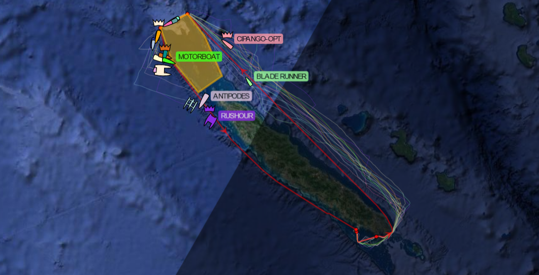En temps réel, pas d’évolution pour les premiers du podium : le catamaran australien Rushour ouvre la route, mais arrivera-t-il à conserver son avance dans ces conditions qui avantagent le monocoque de 22m Antipodes, sur ses talons ?